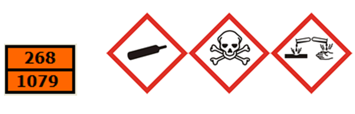 Zkapalněný plyn s typickým zápachem, který je klasifikovaný jako toxický a nebezpečný pro životní prostředí. Páry silně dráždí dýchací cesty, při nadýchání může dojít k plicnímu otoku se zpožděním i několik dní. Kapalný způsobuje popálení kůže a poškození očí. Zkapalněný oxid siřičitý je těžší než vzduch, po úniku se šíří při zemi.