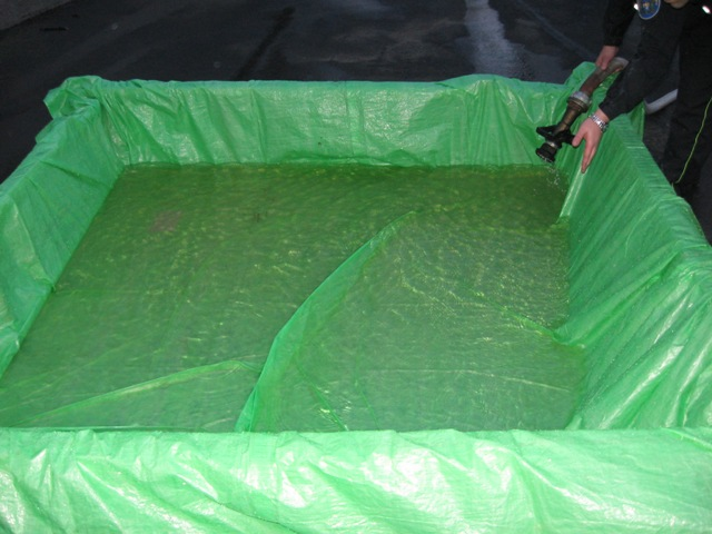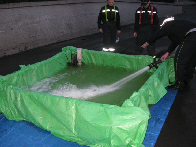 Ad e 1) Jedním ze způsobu zřízení provizorního dekontaminačního stanoviště může být vytvoření prostoru – bazénu pomocí technických prostředků dostupných standardně v cisternových automobilových stříkačkách. Tento typ je vhodný zejména pro provizorní dekontaminaci malého počtu zasahujících hasičů, nebo technických prostředků.