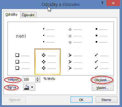 V dolní části okna je tlačítko Odrážky a číslování, které otevře další okno s ještě detailnějším nastavením odrážek a číslování, jako například velikost a barvu nebo dokonce nabízí možnost místo klasických odrážek použít obrázky.
